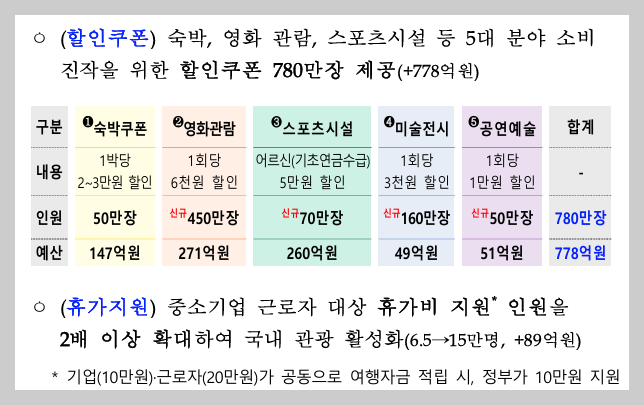 - 숙박, 영화, 스포츠시설, 미술관, 공연 등에 780만 장, 총 778억 원 규모 쿠폰 제공