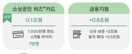 | 정책자금 및 보증 확대 | 융자 5,000억, 보증 2조 원 확대 | 전 소상공인 대상 | 총합 약 25,000억 원 이상 |