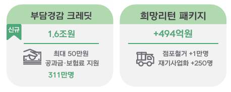 | 부담경감크레딧 | 최대 50만 원 현금성 지원 | 연매출 3억원 이하 소상공인 | 15,660억 원 |