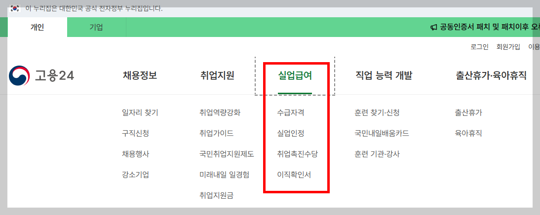 메뉴 선택후 공동인증서 또는 간편인증서 로그인 하면 실업급여 이의 신청에 필요한 메뉴가 보입니다!